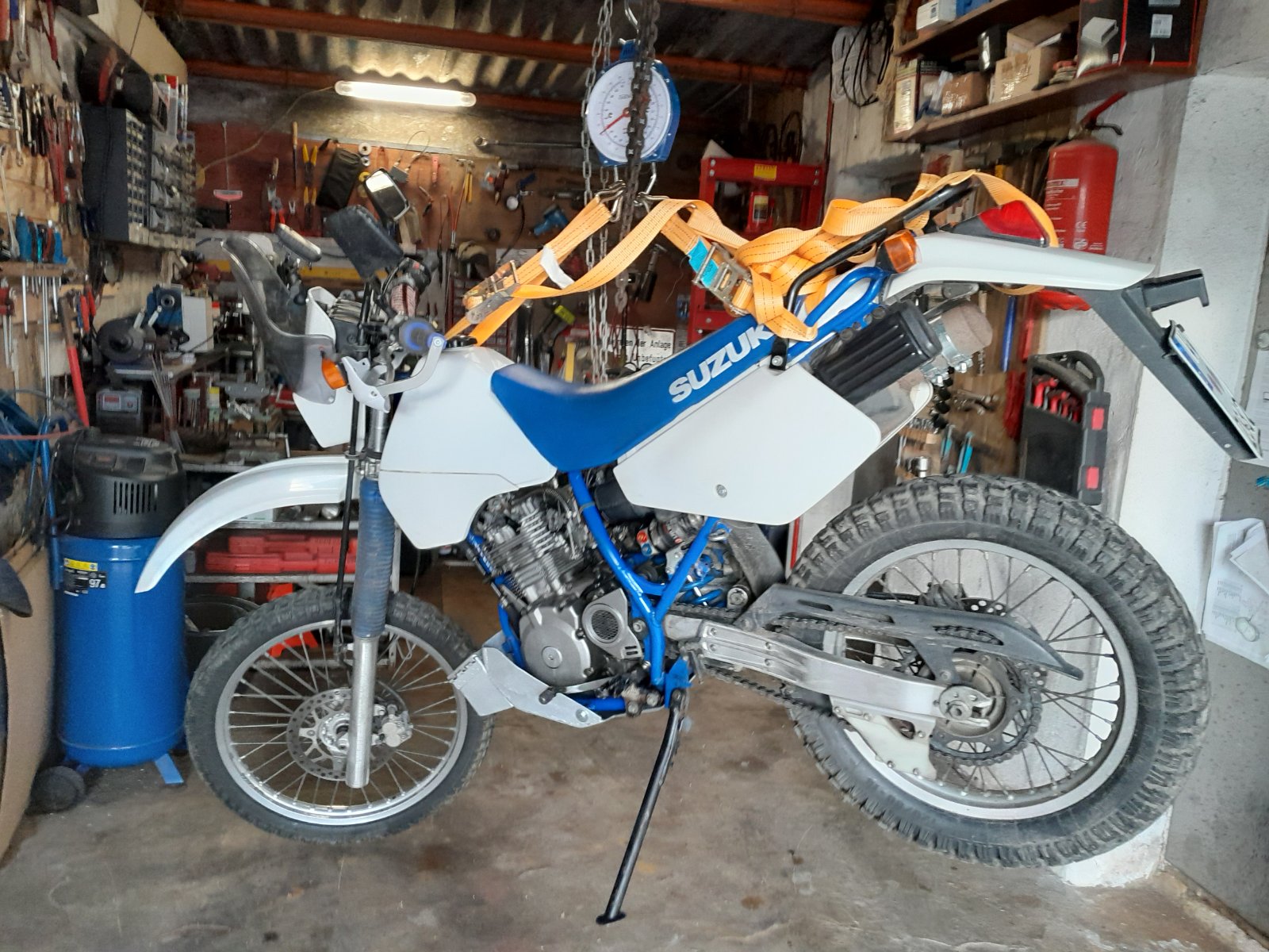 Jetzt mußte ich noch wissen wie schwer die DR komplett vollgetankt inklusive Windschild, Navi, Gepäckträger und Motorschutz samt gefüllter Werkzeugbox wiegt.