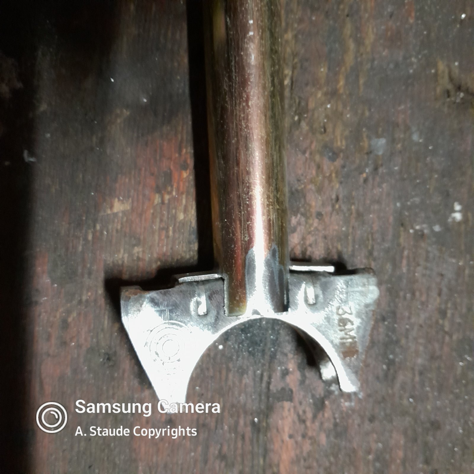 Im oberen "Teleskoprohr" ist dann eine Ausklinkung für das Stück Rohrschelle gemacht wurden. Stück eingepaßt und verschweißt.