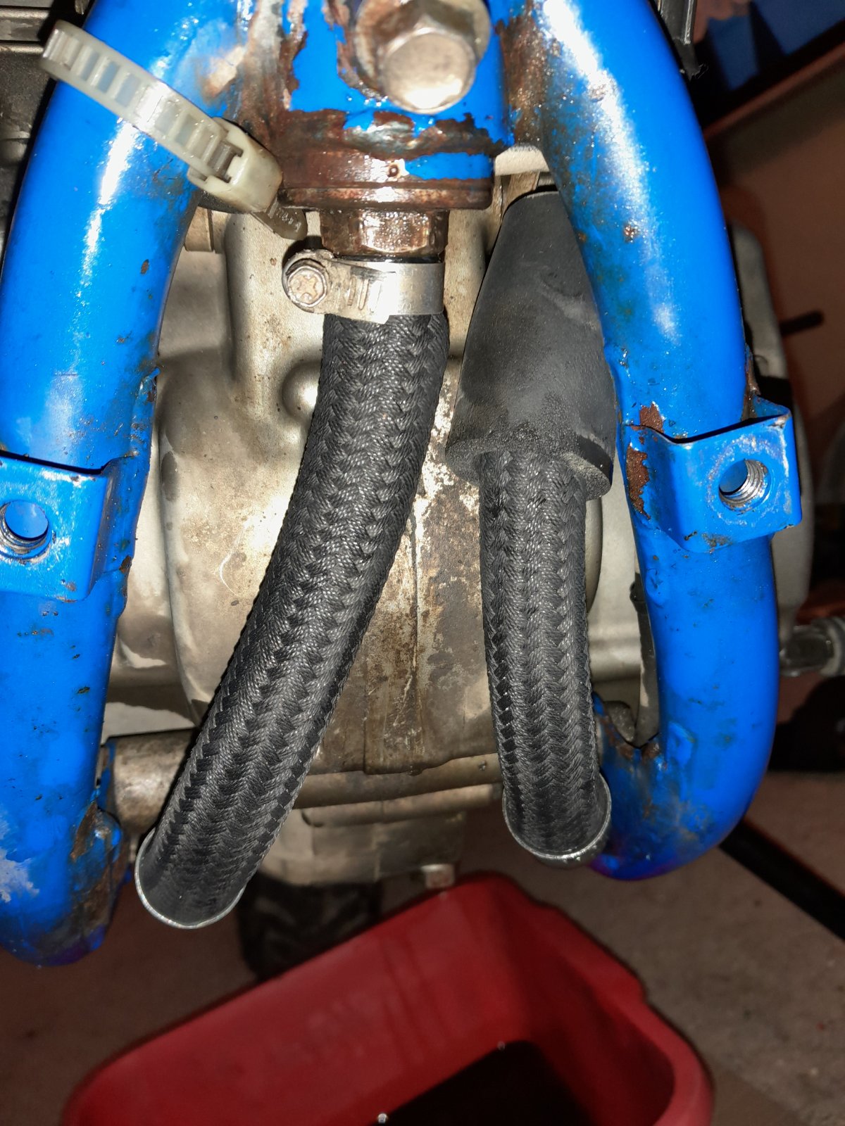 Wechsel der Ölleitungen sowie Öl- und Filterwechsel wurden nach Erhalt des Materials innerhalb von 3 Stunden inklusive Ab- und anbau aller Anbauteile (inklusive des Schutzbleches Rahmen/Tank) erledigt. Aufgefüllt wurden dann 1,9 Liter 10W40.
