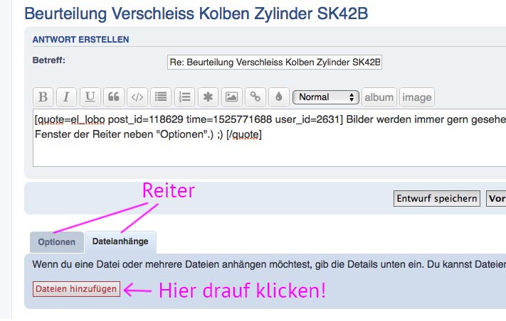 BTW Bilder werden immer gern gesehen, gerade wenn irgendwas kaputt ist! (Im Antwort-Fenster der Reiter neben "Optionen".)