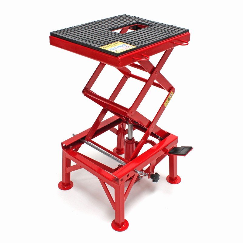 Ein Kollege von mir hat sich seinerzeit aus 40 mm dicken Multilpexplatten ( Mehrschicht-Sperrholz ) eine Adapterplatte mit einer entsprechenden Aussparung für das runde Ölsumpfgehäuse gemacht - so hatte er mehr Ansatzmöglichkeiten das Mööp hoch zu heben . z.B. nur Hinterrad frei -oder nur Vorderrad frei.